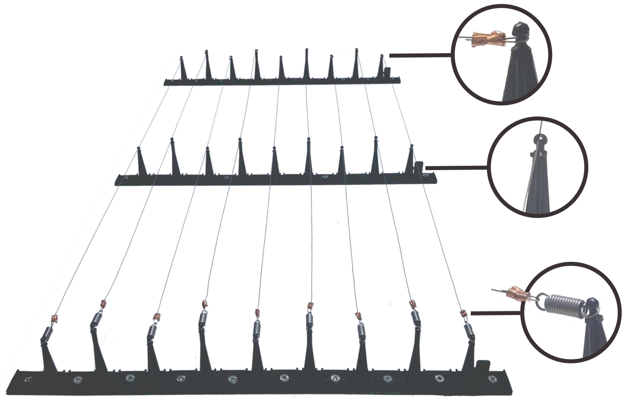 AVITHOR CABLE BIRD consists of one-piece tracks with 9 posts that can be cut to the desired width (3 posts/wires, 5 posts/wires, etc.) The Tracks are made from durable polypropylene and can be installed using either adhesive or screws. The Tracks are placed 1.5 m apart with springs attached to the first, third, fifth, etc row of the track to support the AVITHOR SKY WIRE. AVITHOR SKY WIRE is made with stainless steel, nylon coated wire.